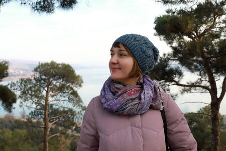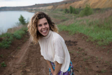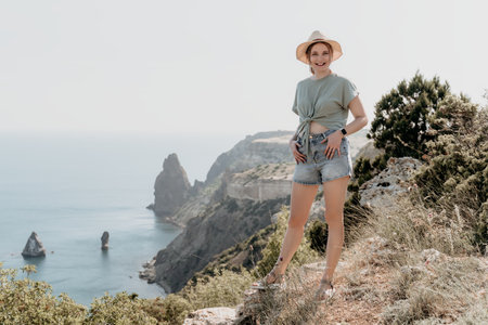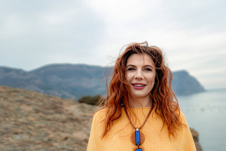 Portrait windswept hair happy woman against a backdrop of mountains and sea. Daylight illuminates the tranquil outdoor setting
