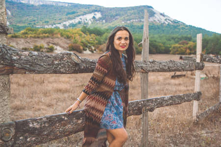Young pretty woman is wearing clothes in bohemian style outdoors near wooden fence with mountains view