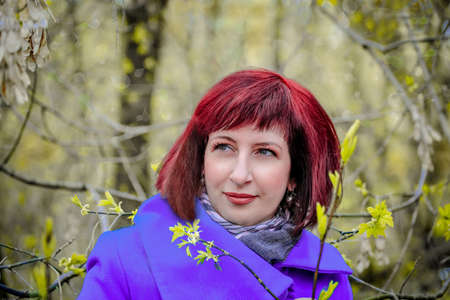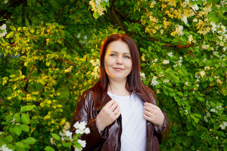 Girl with red hair in a park near a flowering apple tree. Fat woman posing in nature