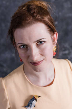 Cheerful middle aged woman dressed in beige dress studio portrait.