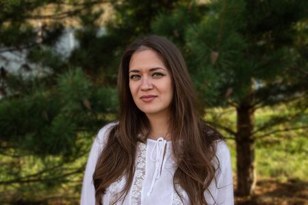 Portrait of a young brown-haired beautiful girl with green eyes and a white blouse on a background of trees