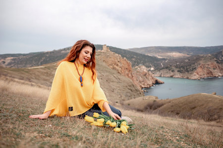 A woman sits on the grass with a bouquet of yellow flowers in her lap. She is looking out at the ocean, taking in the view. Concept of peace and tranquility.