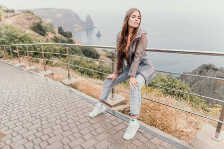 fashion outdoor photo of beautiful sexy woman with blond hair in elegant clothes and accessories posing on a cliff with beautiful sea and mountains view