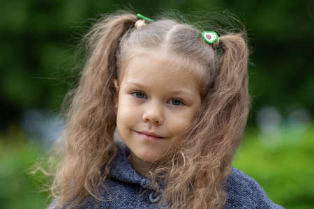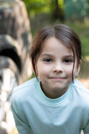 Portrait of cute smiling caucasian girl of five years old looking at camera in the summer park