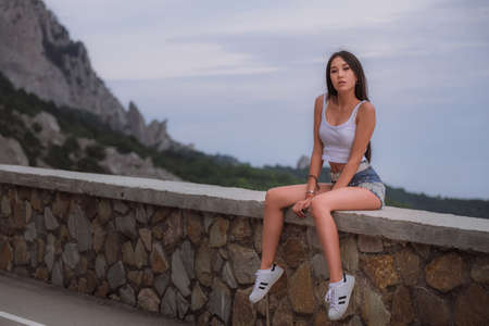Beautiful young woman travels through a mountainous area. The concept and idea of a summer holiday, hitchhiking, finding your own way