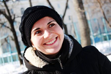 portrait of a smiling woman in profile. The face is covered with hair. No makeup in winter, red cheeks