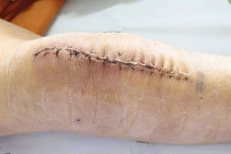 Close-up of a surgical suture after laparoscopic minisk surgery. A man with one knee operated on