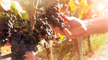 close-up man picking red wine grapes on vine in vineyard.harvest of blue grapes. fields vineyards ripen grapes for wine