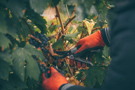 Man worker collecting grapes in vineyard in autumn, harvest concept.
