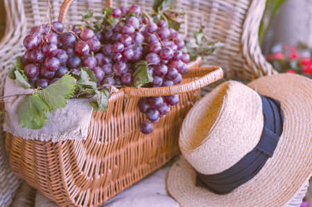 Grapes In A Basket and straw hat In a country house. Collection of selected grapes for homemade wine. Ecological products. Selective focus and tinted photo.