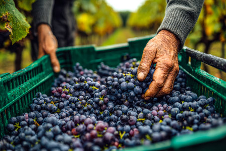 Workers gently pick plump, sun-kissed clusters amid lush greenery and vibrant fall foliage, capturing the essence of seasonal abundance and rural tradition.