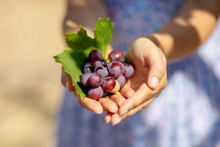 Close up of woman hands holding red grape bunch. Hand holding black grape fruit. harvesting grapes in garden