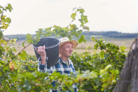 Young man as harvesting assistant in the vineyard with bucket during the vintage