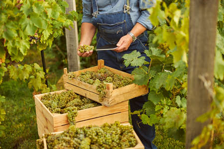 Cropped view of an inspired vintner, female wine grower, middle-aged Hispanic woman eco farmer harvesting ripe juicy organic grapes into a wooden crate, cultivated in an eco vineyard. Viticulture