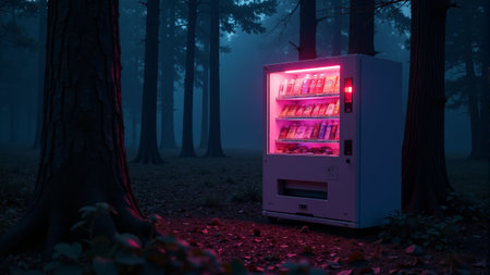 Mysterious vending machine glows amidst foggy forest at dusk, inviting curiosity and exploration