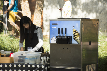 Thai people sale icecream made from ice cream machine for travelers people at street market fair on November 26, 2017 in Nakhon Ratchasima, Thailand