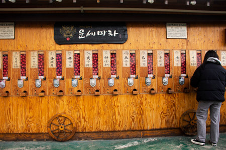 Gashapon fortune eggs or seam si capsule machinery for korean people travel visit and ask answer of fortune Gamcheon Culture Village or Santorini Pusan city on February 18, 2023 at Busan, South Korea