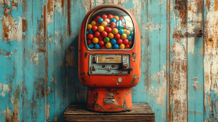Vintage gumball machine, rustic wall, nostalgic tone