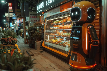 A Robotic Assistant Stands Outside a Convenience Store in a City at Night