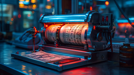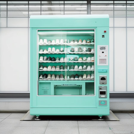 Veding apparatus for automated trade of shoes and sneakers, equipment. Monochrome background, space for text, Generative AI