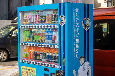 Tokyo, Japan, 2 November 2023: Vending machine with various drinks and high school baseball advertisement