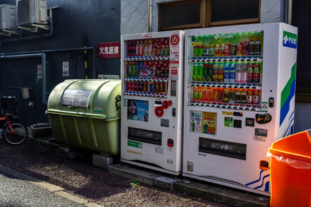 Tokyo, Japan, November 2, 2023: Vending machines and trash collection point on Tokyo street