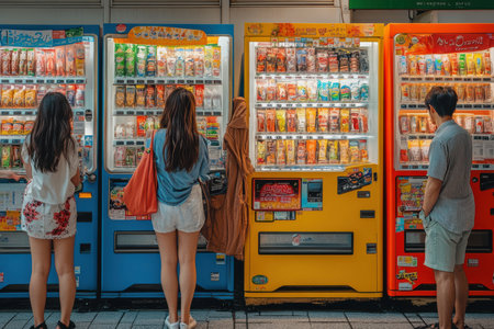 Three people standing in front of vending machines