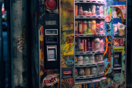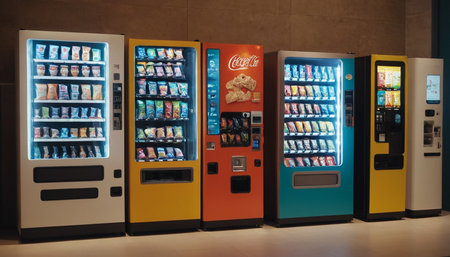 A vibrant close-up image showcasing a vending machine filled with colorful snacks and treats, highlighting the enticing display and modern convenience of automated food selection.