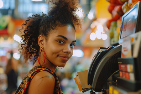 Portrait of young african american woman using credit card machine in shopping mall.