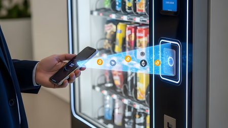 Person using smartphone to pay at a vending machine with cryptocurrency icons displayed.