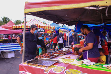 KUALA LUMPUR, MALAYSIA, April 16, 2021: Muslim queing to buy food from street bazaar for iftar or breaking of fast, with observance of social distance and face mask.