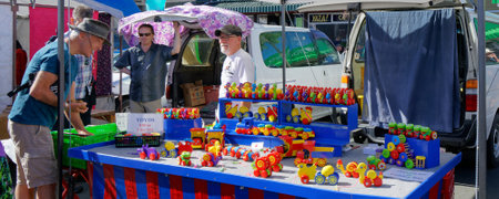 Nelson, Nelson/New Zealand - February 2, 2019: Big boy enthralled by the painted wooden toys on a Nelson market stall.