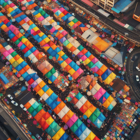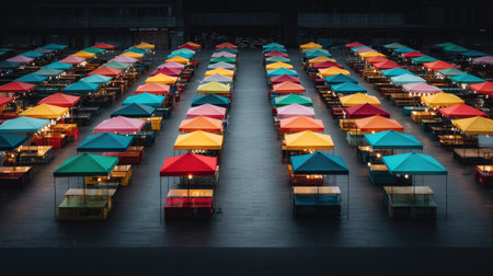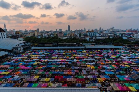 Aerial top view of Night Market people walking street, Colorful tents in the train of Ratchada at Bangkok city, Thailand. Retail shops