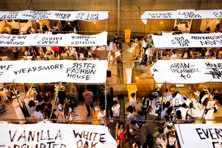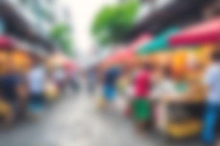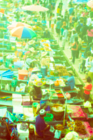 Blurry focus on a crowded handmade market on the closed street in Bangkok, Thailand.
