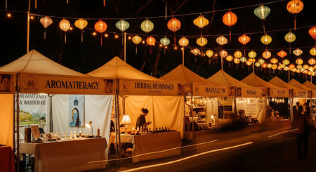An outdoor evening market scene with a food truck and multiple rows of glowing string lights creating a warm bokeh effect against the twilight sky.