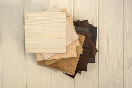 Sampler furniture material dor design or decoration interior. Wood color catalog as texture or pattern. Floor plank for industry