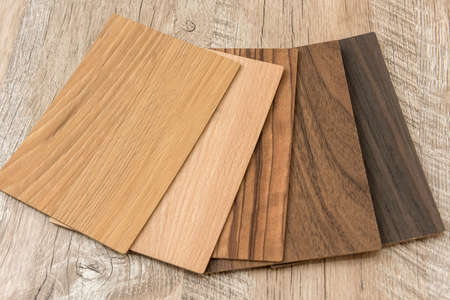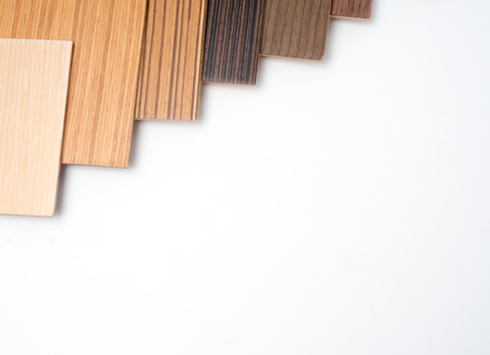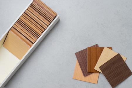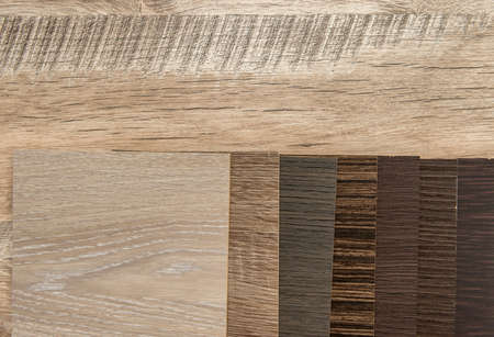 Sample of wood laminated chipboard for furniture design on wooden background with copy space. Color guide displaying a range of hues for use in interior design and decoration, for designers