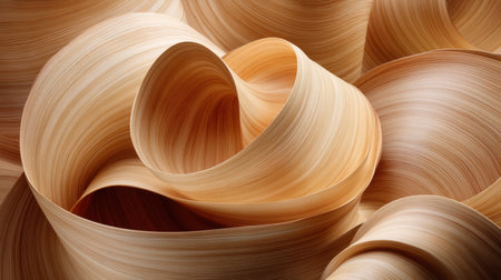 A stunning abstract image of curled wooden strands that highlight smooth textures and warm tones, ideal for artistic and design applications in various projects.