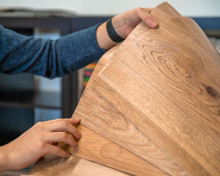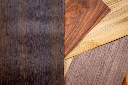 Close up of laminated, veneer, engineering wood flooring samples. Wood texture for furniture and flooring furnishing material samples. interior material design samples.