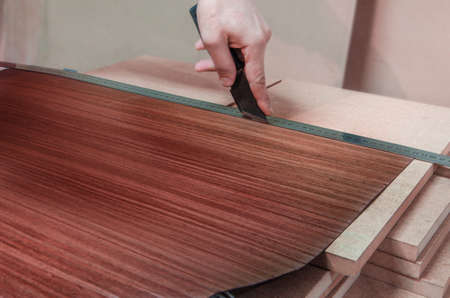 Medium shot of a worker applying veneer sheets onto a wooden panel showcasing the delicate alignment and surface preparation process.