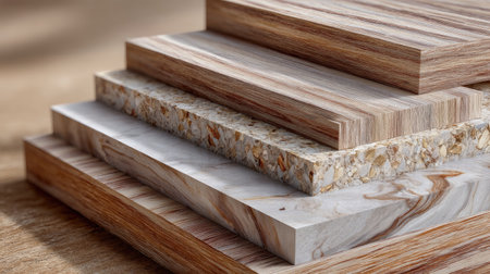A visually appealing stack of wood and composite materials, highlighting unique textures and colors perfect for design inspiration and construction use.