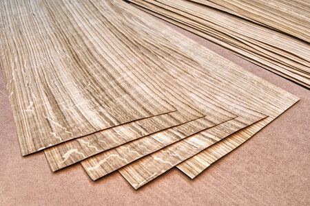 Oak veneer. Oak texture. Spliced oak veneer on the table in the workshop. Close-up
