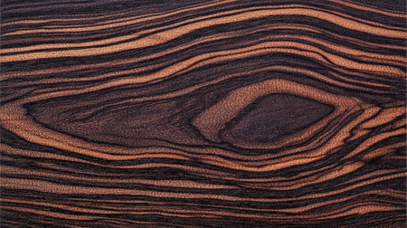 Macro shot highlighting the glossy texture of streaked wood, showcasing prominent dark ebony lines interspersed with warm mahogany colors and a centered swirling knothole detail.