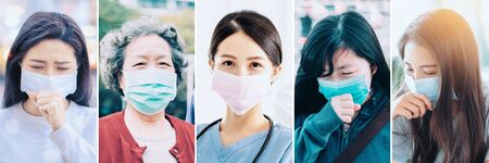 collection of different people wear mask and suffer from cough flu virus