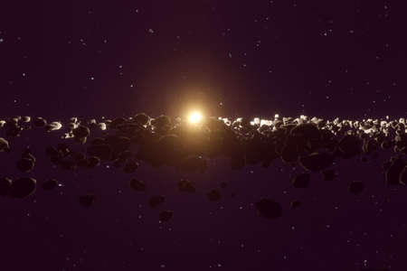 Many asteroids or meteorites in the space horizon with Sun in the center. 3d render