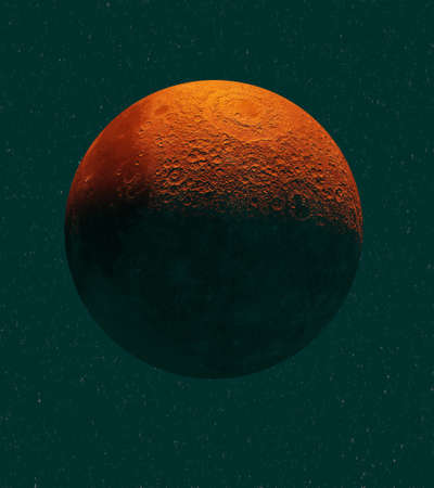3D rendering of the Martian Orbit. Mars in space with illuminated craters and Martian mountains.