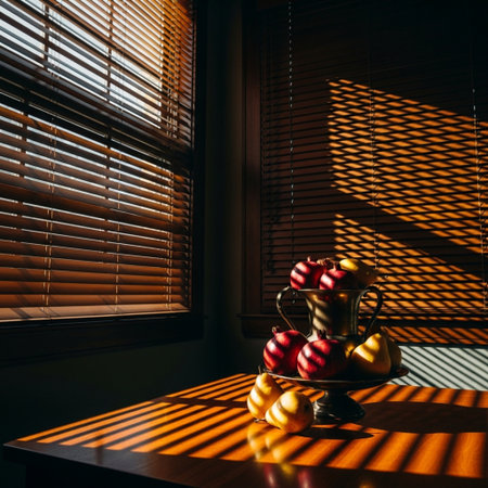 Soft rays filter through slatted blinds, casting intriguing patterns on the wall. A stillness fills the air as shadows shift gently, creating a tranquil atmosphere.