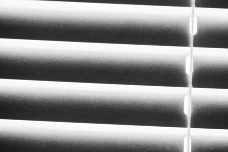 Closed metal jalousie, wand and rope macro image. Background blinds. Black and white photo