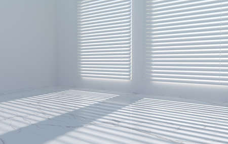 Sunlight coming through venetian louvers blinds by the window at modern and white room in cozy house with copy space on wall