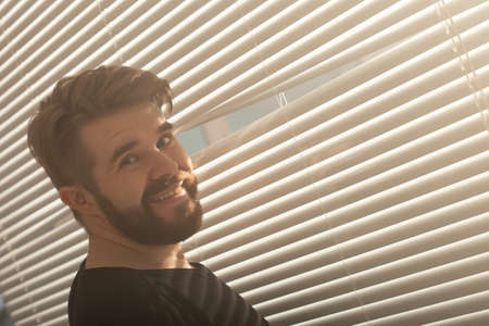 Young man with beard peeks through hole in the window blinds and looks out into the street. Surveillance and curiosity concept